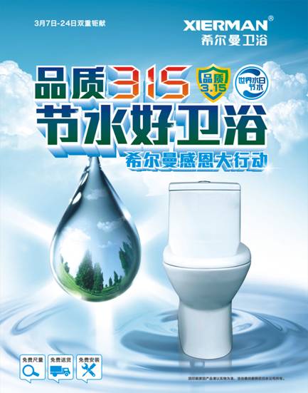 品質315 ,節水好衛浴。希爾曼衛浴本著多年來行業公認的卓越品質,深得消費者厚愛,本次值3.15國際消費者權益日、3.22世界水日兩大節日,希爾曼衛浴義不容辭,以消費者權益為己任,勇擔社會責任,呼吁節能環保,打造舒適、經濟、環保好衛浴,鉅惠活動回饋廣大消費者。